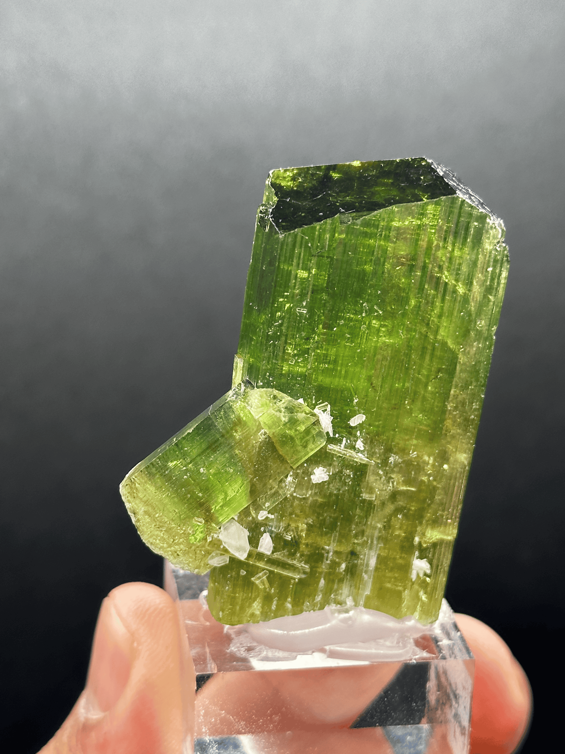 This luminous forest-green Tourmaline from the legendary Paprok Mine in Nuristan, Afghanistan pulses with an almost electric aliveness — its glassy, striated prism catching the light from every angle like a sliver of the Hindu Kush mountains themselves, preserved in perfect crystalline form. Read more below to discover how this beautiful crystal formed in the Earth as well as the metaphysical qualities of the stone. The crystal was displayed with "thumb tack" putty for photography ... the same stuff that your 4th grade teacher stuck papers to the wall with. There is no trace of the non toxic putty left on the crystal when it ships to you. Authenticity guaranteed.